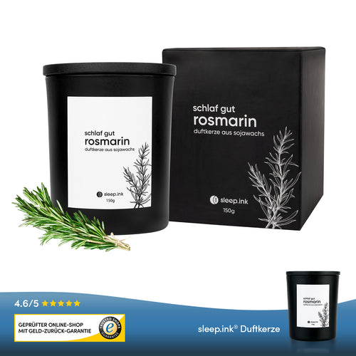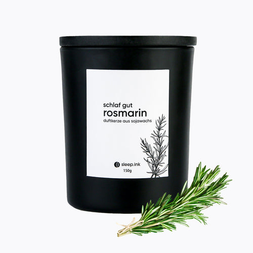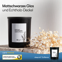 Mit unserer hochwertigen Duftkerze bringen Sie pure Entspannung in Ihr Zuhause. Die nachhaltige Kerze besteht aus 100% veganem Sojawachs, einem bleifreien Docht und verbreitet einen wohligen Rosmarinduft im ganzen Raum. Die Brenndauer der Kerze liegt bei etwa 40 Stunden. Wir empfehlen, den Docht vor jedem Anzünden zu zentrieren. Das hochwertige mattschwarze Glas kann mit einem schwarzen Echtholz-Deckel geschlossen und das natürliche Aroma somit für längeren Duft konserviert werden.