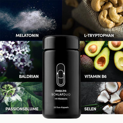 Die äußere Kapsel des SchlafDuos ist mit Melatonin und Baldrian ausgestattet und für die Sofortwirkung zuständig. Sie verkürzt die Einschlafzeit und sorgt für Entspannung. In den inneren Kapseln befinden sich die Wirkstoffe L-Tryptophan, Passionsblumenextrakt, Vitamit B6 und Selen. Sie schützen die Zellen, regulieren den Hormonhaushalt und sorgen dadurch für eine optimale Nachtruhe. Nächtliches Aufwachen gehört der Vergangenheit an.